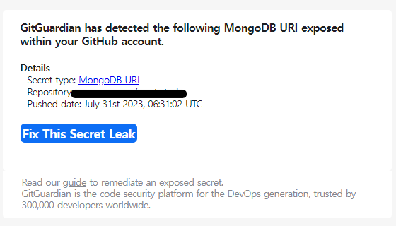 VSCode에서 MongoDB 와 연결해서 사용하기 위해 나의 MongoDB URI 와 아이디,비밀번호가 담긴 코드를 그대로 깃허브에 올렸더니 다음과 같은 메일을 받았다.