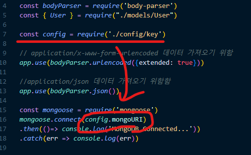 원래는 mongoose.connect(' { 실제 내 MONGOURI'}) 이런식으로 정보가 있었는데 다음과 같이 설정한다.