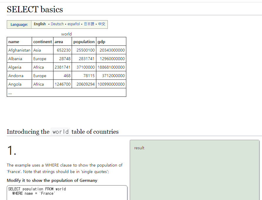 이런식으로 테이블이 있고 테이블을 보며 문제를 풀고, result 에 바로 결과가 나옴