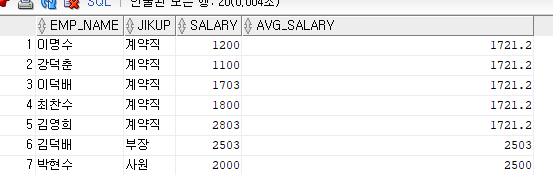 emp_name, jikup, salary, AVG(salary) OVER (PARTITION BY jikup) AS avg_salary
